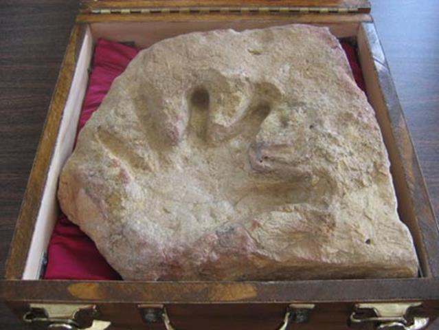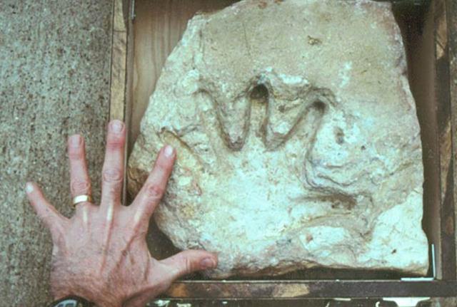 Tại lòng sông Paluxy, gần thành phố Glen Rose, bang Texas, Mỹ, người ta đã tìm thấy các tảng đá in dấu một bàn tay người. Dấu bàn tay này hiện rõ dấu vết của móng tay cái, phần mô giữa ngón cái và ngón trỏ, cũng như vết hằn sót lại sau khi ấn ngón tay giữa xuống bùn. Đây là một bàn tay người hoàn chỉnh.