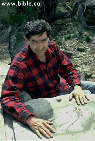 Nhà cổ sinh vật học Jerry MacDonald bên dấu chân 250 triệu năm tuổi. Ảnh: Bible.ca