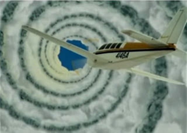 “Đường hầm [gió xoáy] khá lớn lúc ban đầu, nhưng sau đó bắt đầu trở nên nhỏ hơn một cách nhanh chóng khi chúng tôi tiến vào, và một điều kinh khủng đã xảy ra. Các đường kẻ kỳ lạ đã hình thành và nó trông giống như nhìn vào bên trong một nòng súng trường (súng có nòng xẻ rãnh xoắn), bởi vì các đường kẻ này đang xoáy chầm chậm ngược chiều kim đồng hồ. Tôi đã bắt gặp một vài luồng điện cực mạnh, chúng giống như các tia chớp lóe lên rồi vụt tắt và tất cả những gì tôi có thể nhìn thấy là đám sương mù kỳ lạ màu vàng xám này, mà tôi gọi là “đám sương mù điện tích”. Tôi để ý thấy các thiết bị của tôi đã ngừng hoạt động, và cùng lúc, tôi có một cái cảm giác thật khó tả”. – Bruce Gernon.
