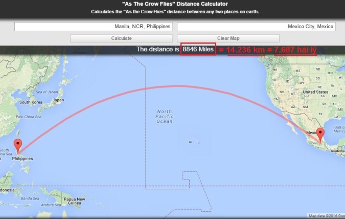 Khoảng cách tương đối theo đường chim bay từ thủ đô Manila, Philippines đến thủ đô Mexico city, Mexico ở hai bên bờ Thái Bình Dương. (Ảnh: Internet)