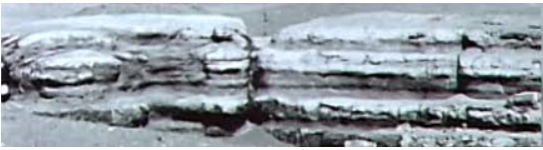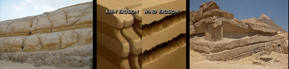 Bức bên trái: Bức tường phía nam của Tượng Nhân sư bị xói mòn do nước, bức ở giữa: Hình minh họa chụp màn hình từ bộ phim tài liệu Bí ẩn của tượng Nhân sư cho thấy mưa và gió xói mòn; bức bên phải: Các công trình kiến trúc trên Cao nguyên Giza được các nhà Ai Cập học xác định niên đại từ thời Vuadon cổ đại chỉ cho thấy sự xói mòn do gió.
