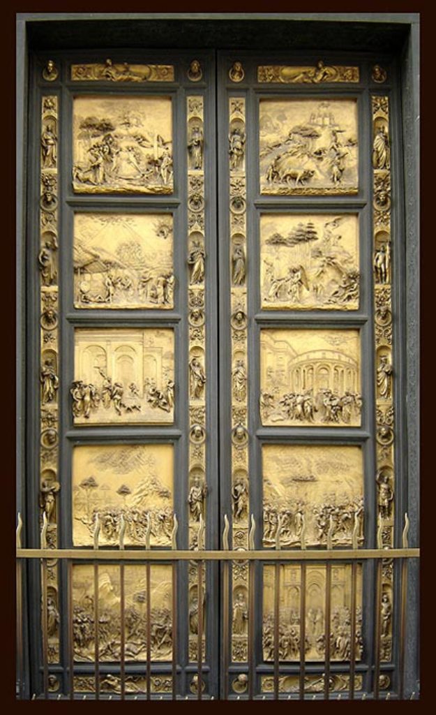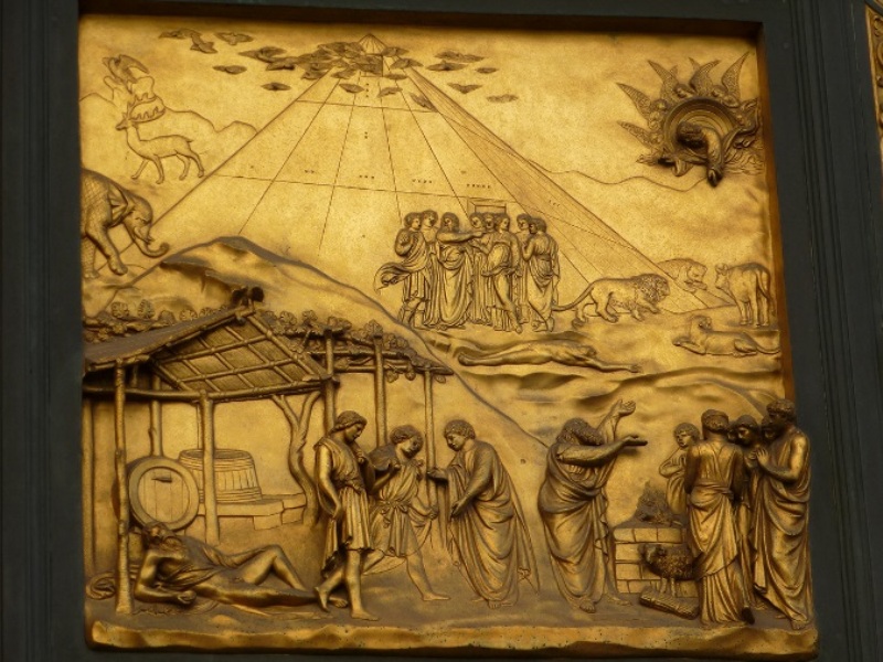 Trên cánh cửa dẫn vào nhà thờ Baptistery ở Florence, Ý của họa sĩ thời kỳ Phục Hưng Lorenzo Ghiberti, có một tấm pano minh họa cuộc đời của Noah sau khi ông trở lại đất liền. Điều kỳ lạ là, con tàu ông dùng có hình dạng của một kim tự tháp. (Ảnh: Internet)