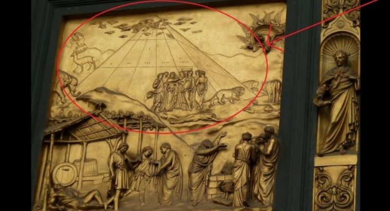 Các tấm pano trên cánh cửa dẫn vào nhà thờ Baptistery ở Florence, Ý của họa sĩ thời kỳ Phục Hưng Lorenzo Ghiberti, minh họa các cảnh tượng trong Kinh Cựu Ước. Một trong những tấm pano minh họa cuộc đời của Noah, đặc biệt là trong giai đoạn sau trận Đại Hồng Thủy, khi Noah trở lại đất liền với sự trợ giúp của Chúa. Điều kỳ lạ là, con tàu ông dùng có hình dạng của một kim tự tháp, từ đó củng cố thêm cho luận điểm mới này.