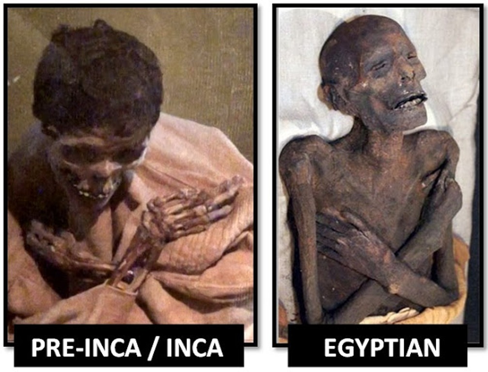 Người Ai Cập và người Inca/Tiền Inca cổ đại đều xây dựng các kim tự tháp đá và kim tự tháp bậc thang trên sa mạc dọc theo các con sông và nằm thẳng hàng với bốn hướng chính (đông, tây, nam, bắc). Và họ đều mai táng người chết bên trong.