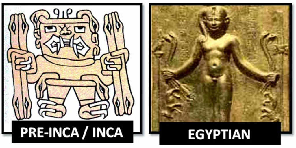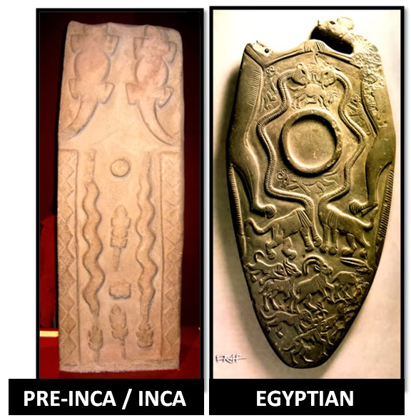Người Ai Cập và người Inca/Tiền Inca cổ đại đều sử dụng biểu tượng rắn đối xứng trên rất nhiều tác phẩm nghệ thuật.