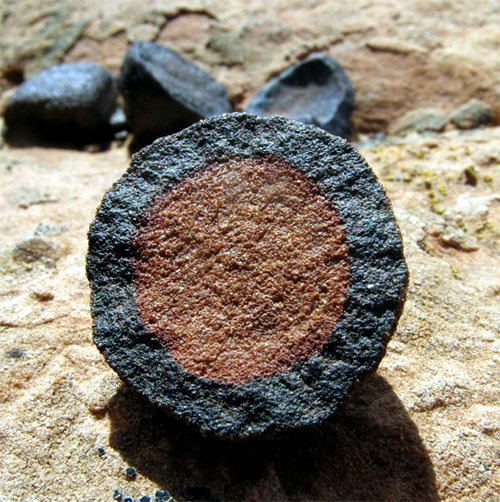 Tiết diện cắt ngang của một viên bị Moqui với lõi bên trong bằng cát và lớp vỏ ngoài cứng, làm từ oxit sắt. (Ảnh: Wikimedia)