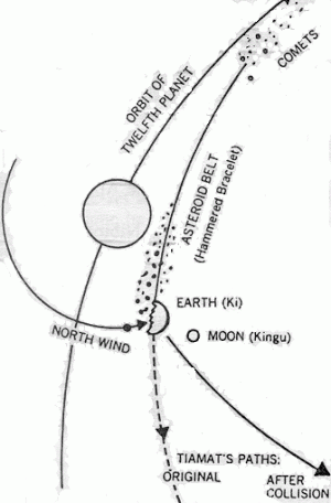 Nibiru lúc này là một hành tinh lớn “lang thang” bị hút vào quỹ đạo của Thái Dương Hệ. Do đến từ ngoài hệ mặt trời, nó gây ra các xáo trộn ảnh hưởng đến các quỹ đạo các vệ tinh của các hành tinh hiện có. Trục Thiên vương tinh bị nghiêng sang một bên. Diêm vương tinh bị trôi dạt ra khỏi quỷ đạo của Thổ tinh và xoay quanh quỷ đạo mới của riêng mình. Lực hút cũng bẻ cong đường đi của Nibiru gây ra các va chạm. Đầu tiên vệ tinh của nó va chạm với hành tinh lớn Tiamat, và sau đó chính nó cũng chạm vào hành tinh này, mảnh vở lớn nhất của nó hình thành nên trái đất ngày nay, và vệ tinh của kẻ xâm nhập cũng trở thành mặt trăng của hành tinh chúng ta. Những mảnh vụn nhỏ lớn tạo thành các vành đai tiểu hành tinh (asteroid belt) và thiên thạch, sao chổi lang thang trong hệ mặt trời. Vành đai Thái Bình Bình Dương được cho là cái sẹo còn lại sau sự kiện va chạm này.