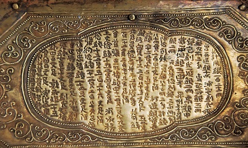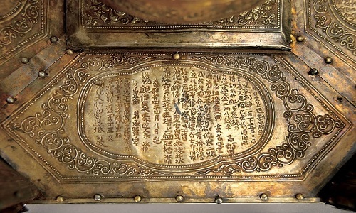 Chữ khắc trên rương đá được viết bởi hòa thượng Đức Minh. Theo hòa thượng Đức Minh, sau khi Đức Phật nhập vào cõi niết bàn, cơ thể ngài được hỏa táng gần sông Hirannavati ở Ấn Độ. Hoàng đế cái trị Ấn Độ thời đó là Ashoka (trị vì từ năm 268 đến 232 trước Công nguyên) quyết định bảo quản di cốt của Đức Phật bằng cách chia thành tổng cộng 84.000 phần. Trung Quốc được giao lưu giữ 19 phần, bao gồm mảnh xương sọ.