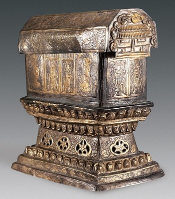 Theo các nhà khảo cổ, mảnh xương sọ của Đức Phật được đặt trong quan tài cực nhỏ bằng vàng. Chiếc quan tài này lại được đặt trong một quan tài bạc khác. Sau đó, quan tài bạc được đặt vào trong tháp chứa di cốt.