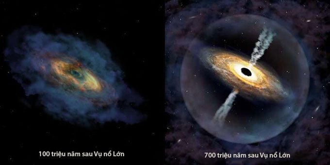 Chuẩn tinh J1007 + 2115 (bên phải) hình thành từ hố đen hạt giống (bên trái). (Ảnh: Phys).