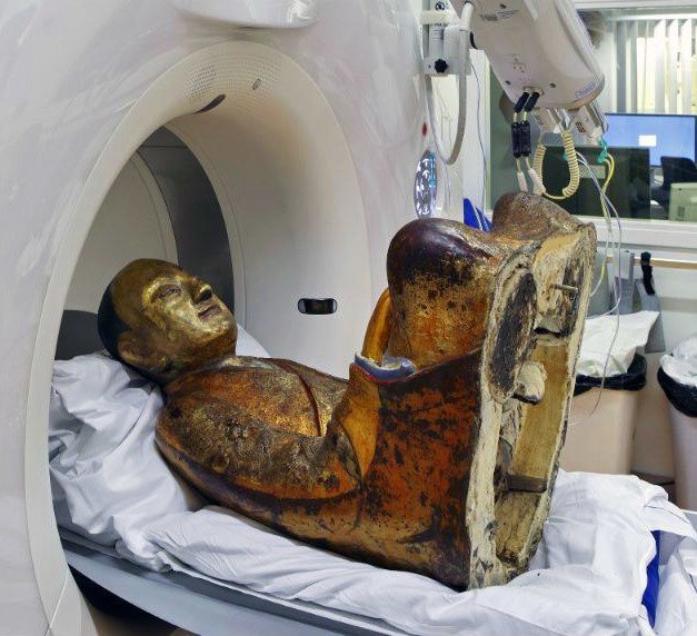 Một nhóm các nhà nghiên cứu đã tiến hành chụp cắt lớp vi tính CT trên bức tượng và phát hiện thấy một xác ướp bên trong. Họ nhận thấy cơ quan nội tạng của xác ướp đã biến mất.