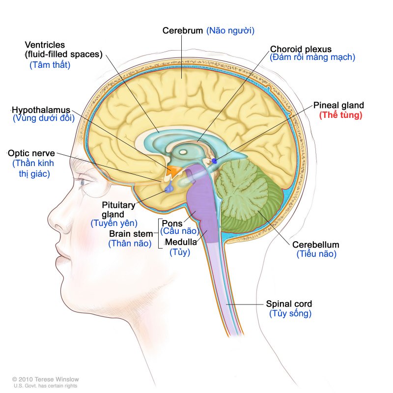 Tín hiệu này hướng về phía hạt nhân của vùng dưới đồi (hypothalamus). Từ vùng dưới đồi, nó truyền theo đường đa thần kinh giao cảm gọi là tâm thất của vùng dưới đồi (hypothalamus), theo các tế bào thần kinh thoát ra khỏi hạch cổ trên để tới được thể tùng quả.