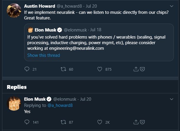 Hôm chủ nhật vừa rồi, nhà khoa học máy tính Austin Howard đã hỏi Musk trên Twitter về việc liệu một ngày nào đó, nhạc có thể được stream trực tiếp thông qua giao tiếp não - máy vào não của chúng ta, nói cách khách là nghe nhạc không cần tai nghe hay không thì Musk trả lời ngắn gọn: "YES".