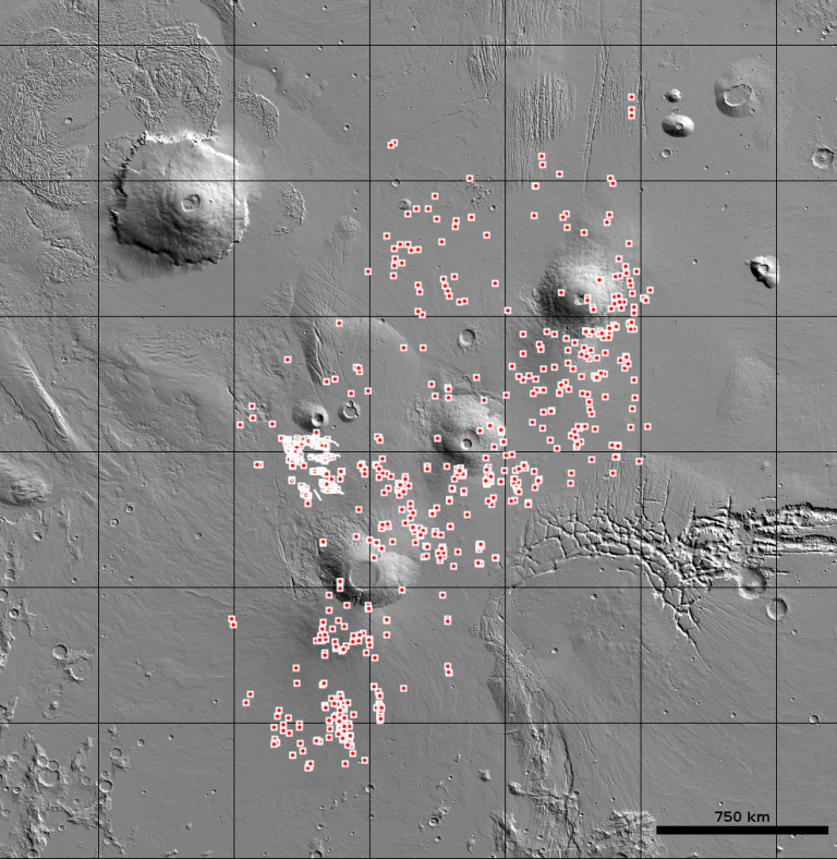 Nhiều lối vào các hang động và giếng trời ống dung nham mà USGS đã xác định trên Sao Hỏa nằm ở Vùng Tharsis sau núi lửa. Trong hình ảnh này, mỗi dấu chấm màu đỏ là một lối vào tiềm năng. (Ảnh: Danh mục ứng cử viên hang động toàn cầu USGS / Mars).