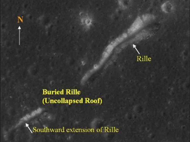 Hình ảnh của một ống dung nham đã bị sụp đổ một phần gần xích đạo mặt trăng, được chụp bởi quỹ đạo mặt trăng Ấn Độ Chandrayaan-1. (Ảnh: Trung tâm ứng dụng không gian Ấn Độ)