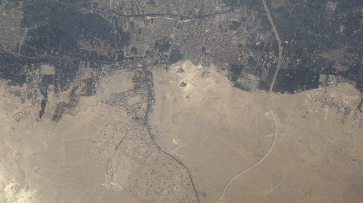 Ảnh vệ tinh của kim tự tháp tại cao nguyên Giza nhìn từ không gian vũ trụ. Ảnh: NASA Visible Earth.