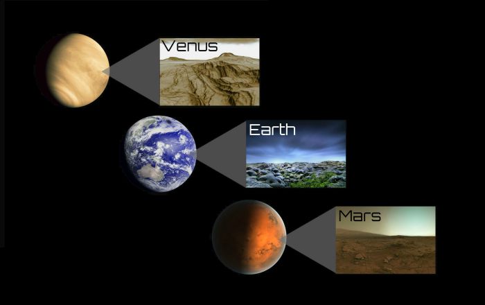 Cảnh tượng bề mặt trên 3 hành tinh Sao Kim, Trái Đất, Sao Hỏa (lần lượt theo thứ tự gần Mặt Trời nhất). Sao Kim nóng bức do nước bốc hơi, Sao Hỏa lạnh giá nhưng khô cằn. Chỉ có Trái Đất là ở vị trí thích hợp để nuôi dưỡng sự sống. Ảnh: futurism