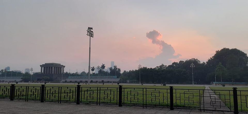 Một bức ảnh được chụp tại quảng trường Ba Đình, khu vực trước lăng Bác. Ở góc chụp này, đám mây có hình thù đầy kì diệu với dáng vẻ của một con rồng đang bay lên. Bên cạnh đó, ánh sáng từ đằng sau lăng Bác càng khiến dân mạng trầm trồ. Ảnh: MXH