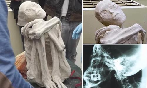 Điều dị thường là xác ướp này có hộp sọ dài, mắt hình hạnh nhân và chân tay chỉ có 3 ngón. (Ảnh: dailymail.co.uk)