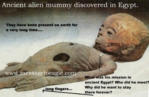 Xác ướp nghi là người ngoài hành tinh được phát hiện trong căn phòng ở Kim Tự Tháp Cheops. (Ảnh: messagetoeagle.com)