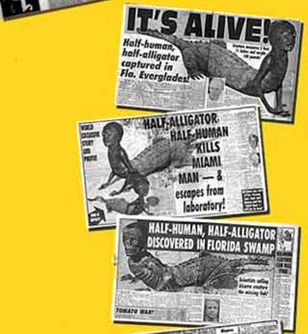 “Lại thêm một sinh vật chưa đi hết chặng đường tiến hóa. Quái nhân có đầu và nửa cơ thể trên giống người, còn nửa thân dưới đích thực là của loài bò sát - đã bị bắt sống khi đang nằm phơi nắng gần khu vực đầm lầy Big Cypress” - bài báo lá cải mở đầu bằng giọng hùng hồn.