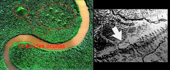 Quần thể kim tự tháp bí ẩn Paratoari trong rừng Amazon. (Trái: Ảnh chụp vệ tinh từ Google Earth, Phải: Ảnh chụp vệ tinh từ NASA)
