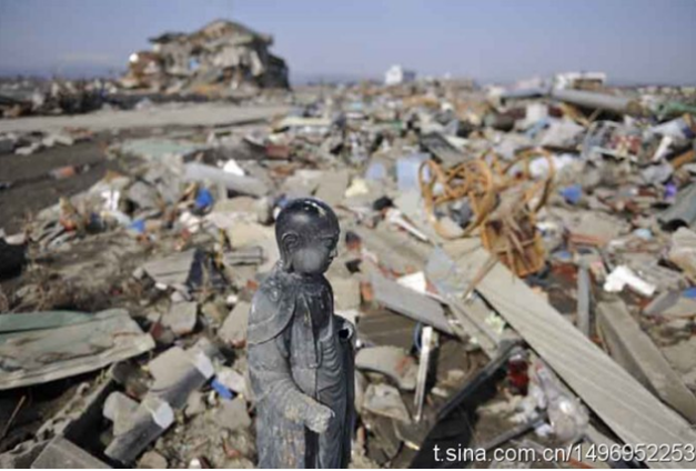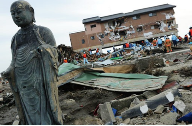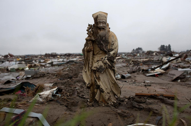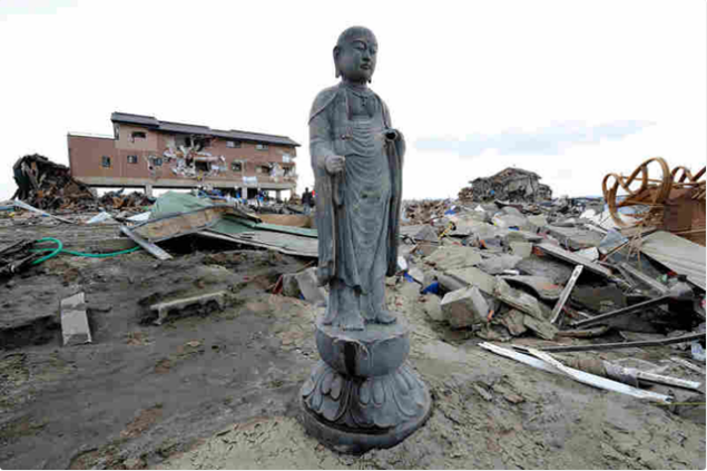 Bức tượng Địa Tạng Vương Bồ Tát đứng thẳng vững chãi trong đống hoang tàn đổ nát – hậu quả khủng khiếp từ trận động đất và sóng thần thế kỷ. Ảnh: npr.org
