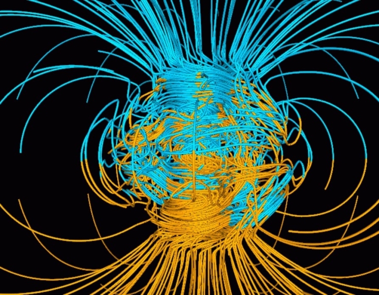 Mô phỏng trên máy tính về từ trường Trái đất, được tạo ra bởi sự truyền nhiệt trong lõi Trái đất. (Ảnh: NASA/Gary A. Glatzmaier qua ĐH Texas)