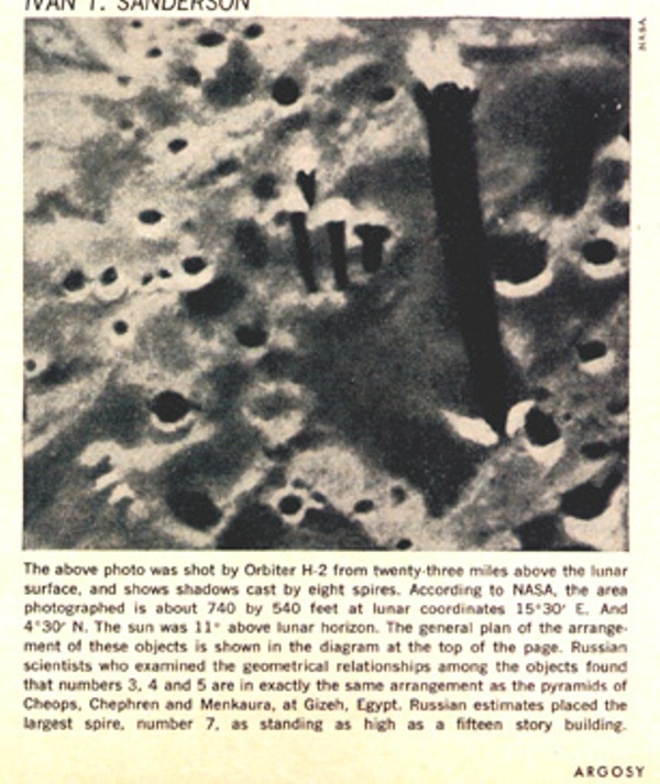 Ngày 20/11/1966, tàu thăm dò quỹ đạo số 2 của Mỹ đã chụp được một cấu trúc hình kim tự tháp từ độ cao 46 km, và các nhà khoa học ước tính nó có độ cao từ 15 đến 25 mét, với màu sắc nhạt hơn nham thạch và đất ở xung quanh, cho thấy đây không phải cấu trúc hình thành trong tự nhiên. Nếu những kết cấu hình tháp phản xạ ánh sáng này do một chủng loại sinh vật thông minh thời xưa tạo ra, thì mục đích của nó là gì?