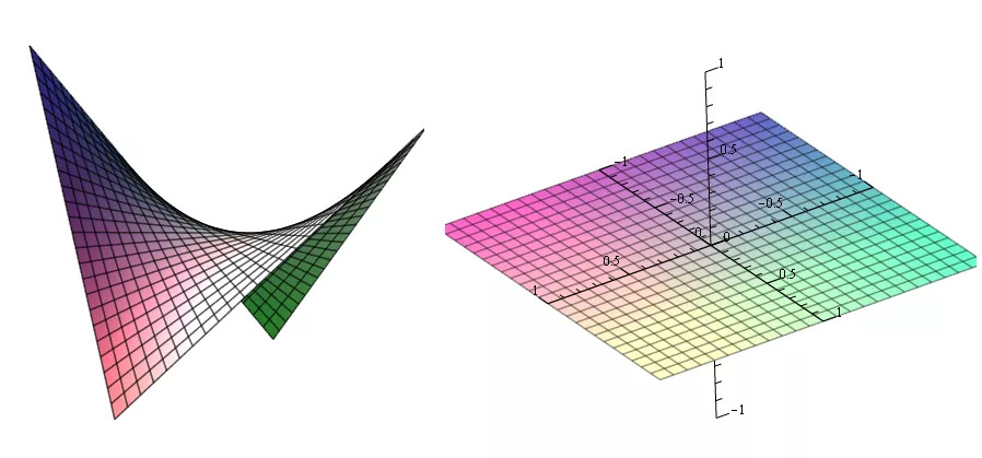 Không gian Anti-de Sitter (trái) tự uốn cong. Vũ trụ của chúng ta (bên phải) được cho là phẳng. (Ảnh: Physics Mill)