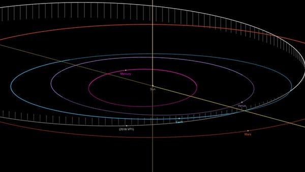 Quỹ đạo của tiểu hành tinh 2018 VP₁ giao với quỹ đạo của Trái đất hai năm một lần. (Ảnh: NASA / JPL)