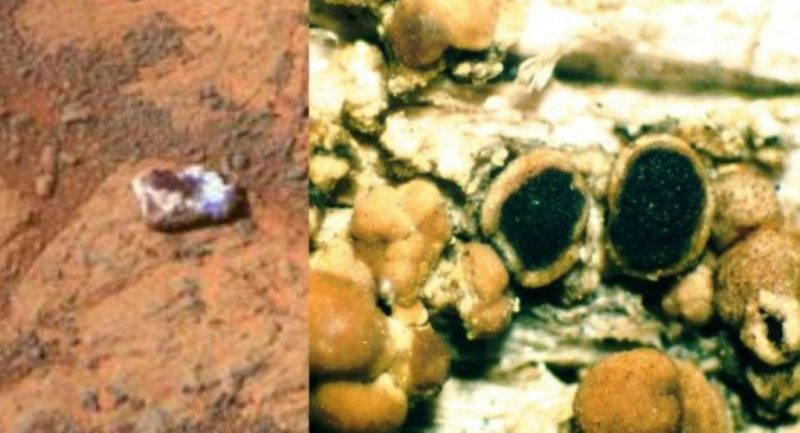 Vật thể được phát hiện trên Sao Hỏa (trái) và Apothecia, một loại nấm, trên Trái Đất (phải). Tiến sĩ Rhawn Gabriel Joseph nhận định rằng vật thể trên bề mặt Sao Hỏa có thể là một loại nấm. (Trái: NASA, phải: Wikimedia)