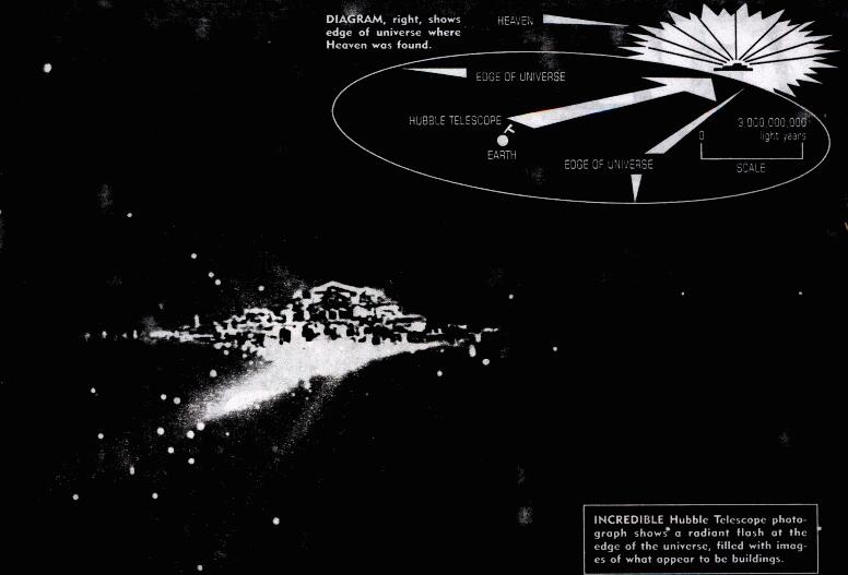 Ngày 8/2/1994, trang Weekly World News công bố một bức ảnh được chụp bởi kính viễn vọng không gian Hubble vào ngày 26/12/1993, cho thấy hình ảnh giữa bầu trời đêm mênh mông vô tận, xuất hiện một thành phố tỏa ra ánh sáng, được cho là “thế giới thiên quốc” mà những người có đức tin hằng tìm kiếm.