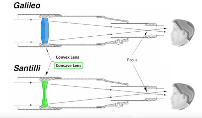 Không giống như các kính thiên văn Galileo thông thường sử dụng một thấu kính lồi, kính thiên văn Santilli sử dụng một thấu kính lõm.
