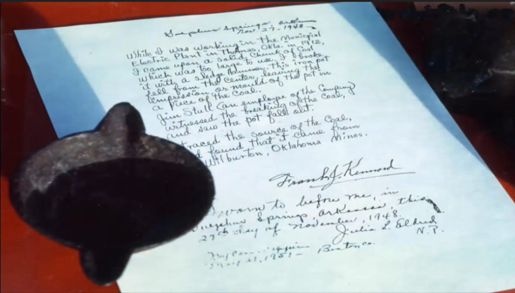Bên cạnh chiếc cốc sắt trong bảo tàng nói trên có lời làm chứng của ông Frank Kenwood. Theo ông Frank Kenwood, năm 1912 khi ông làm việc ở một nhà máy nhiệt điện thì gặp một khối than đá rất lớn. Ông liền lấy búa đập nó ra thì vô cùng ngạc nhiên khi phát hiện ở bên trong khối than đá có một chiếc cốc còn nguyên vẹn. Có một công nhân khác chứng kiến sự kiện này tên là Jim Stolle.