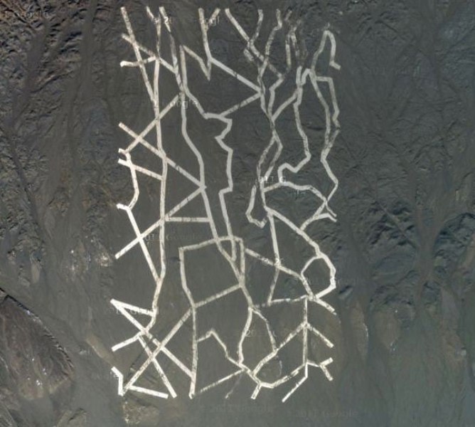 Hai hình trong số đó dài khoảng 2km, rộng khoảng 1km, trông hơi giống bản đồ đường phố không có nhà cửa. Một số chuyên gia cho rằng những tam giác lớn có thể để mô phỏng những con đường trong thành phố khi Trung Quốc thử tên lửa.