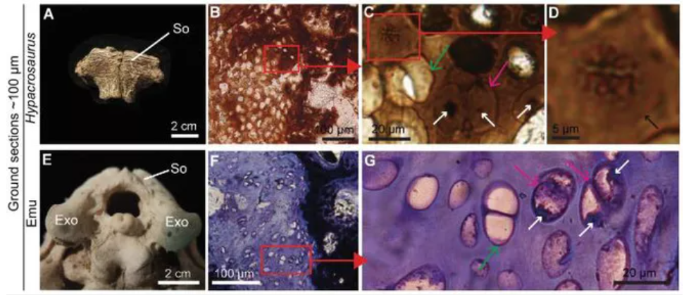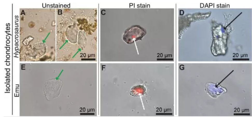 Thông qua quan sát bằng kính hiển vi, các nhà nghiên cứu đã tìm thấy hai tế bào sụn vẫn được liên kết với nhau bởi các cầu nối trong các mảnh của hộp sọ Hypacrosaurus. Vật liệu giống với nhân tế bào cũng được phát hiện, ngoài ra mẫu hóa thạch này cũng chứa các cấu trúc kéo dài "phù hợp về mặt hình thái" với nhiễm sắc thể.
