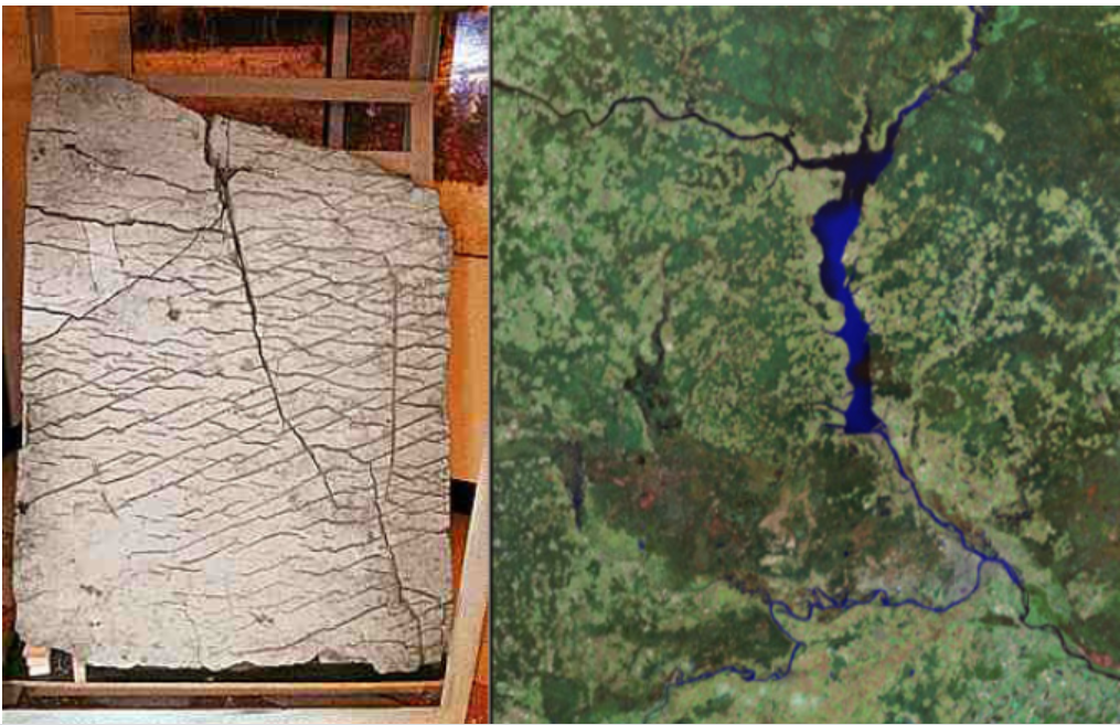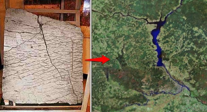 Trái: Phiến đá bản đồ đựoc nói tới. Phải: Ảnh chụp vệ tinh vùng núi Ural từ trên không.
