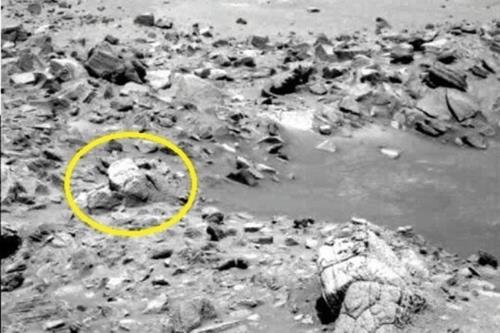 Khối đá trông giống bức tượng tạc hình thần Anunnaki trong tín ngưỡng Sumer trên Sao Hỏa. Ảnh: NASA