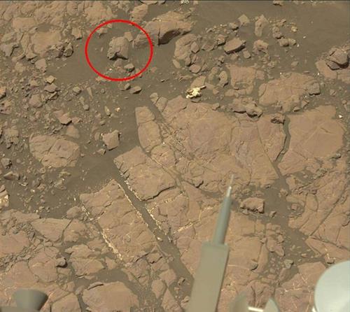 Ảnh chụp bề mặt Sao Hỏa của tàu thăm dò Curiosity, bao gồm vật thể kỳ dị giống hình đầu người được nói đến. Ảnh: NASA