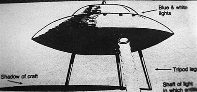 “Nó chiếu sáng toàn bộ khu rừng bằng một thứ ánh sáng trắng đến lóa mắt. Phần thân trên của vật thể ấy có gắn một thứ đèn màu đỏ, và một quầng sáng xanh bên dưới. Nó bay lơ lửng hoặc cũng có thể là có chân”.