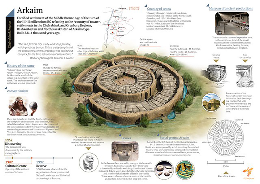 Năm 1987, khi chính phủ Liên Xô cũ xây dựng một hồ chứa ở bồn địa Arkaim, một quần thể kiến trúc hình tròn khổng lồ bí ẩn đã được phát hiện ở trung tâm của bồn địa, ngày nay là chính là thành phố Arkaim.