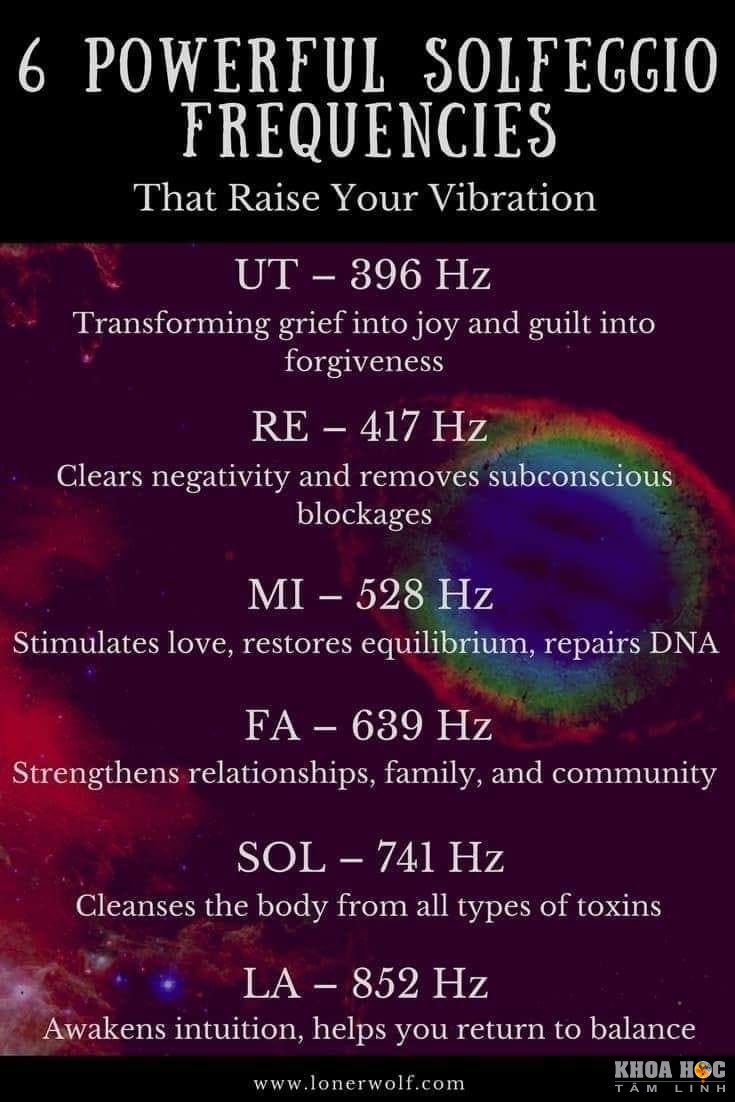 Tần số Solfeggio là 6 loại tần số âm thanh điện từ lặp đi lặp lại. Và công dụng của nó đối với THÂN-TÂM-TRÍ của con người như sau: