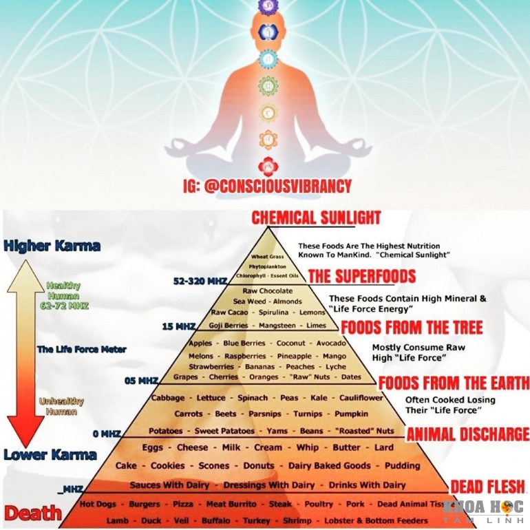 Thực vật là loài có rung động tốt, cao; ngược lại thì thịt động vật luôn chứa rung động thấp. Khi con thú bị giết, chúng phát ra 1 năng lượng sợ hãi lớn. Năng lượng này tỏa ra xung quanh và “ngấm” sâu trong thịt, khi ta ăn thì “oán khí” ấy vào bụng và sẽ sinh ra nhược khí gây nên ung thư. Đó là kiến thức của bên tâm linh, còn khoa học thì chứng minh rằng khi thú bị giết, nó sợ hãi và trong thịt sinh ra 1 chất độc, người ăn vào sẽ không tốt. 2 trường phái đều bù trừ cho nhau thế đấy. Người ta cũng đã chụp thể năng lượng của thịt và hoa quả, xong kết quả cho chúng ta biết rằng hoa quả dù bị vặt trên cây từ nhiều ngày nhưng vẫn tỏa ra 1 vùng ánh sáng tốt.