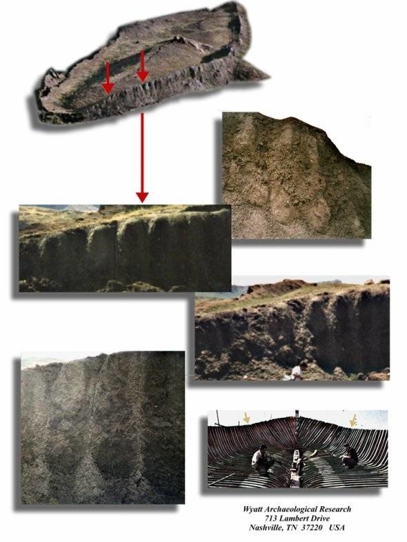 Gỗ của con tàu đã bị hóa thạch. Các chất hữu cơ đều đã bị thay thế bằng khoáng chất, chỉ còn lại hình thù và dấu vết của các thanh sườn tàu. Gỗ đều đã hóa thạch và xói mòn từ rất lâu trước đó. Nhưng chúng ta có thể dễ dàng quan sát thấy hình dáng uốn cong của nó. Xung quanh đó là rất nhiều sườn khung khác, phần lớn bị chôn vùi trong đất, kiểm tra kỹ đều có thể thấy được: