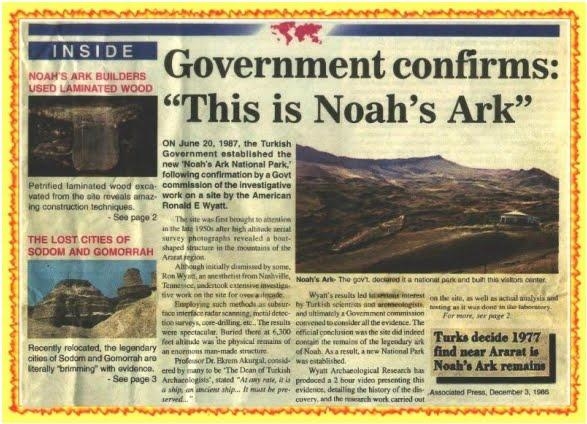 Vào ngày 20/6/1987, Thống đốc tỉnh Agri của Thổ Nhĩ Kỳ tuyên bố với thế giới rằng: Bộ Ngoại giao, Bộ Nội vụ, các nhà nghiên cứu thuộc trường Đại học Ataturk, cơ quan khảo cổ Thổ Nhĩ Kỳ… đã công nhận vật thể hình chiếc tàu trên ngọn núi Ararat tại độ cao 2.000m so với mực nước biển là con tàu của Noah. Khu vực này trở thành công viên quốc gia - một báu vật quốc gia của họ. Đây là một trong những phát hiện lịch sử học và khảo cổ học vĩ đại nhất, cho thấy Đại hồng thủy và con tàu Noah thực sự tồn tại.