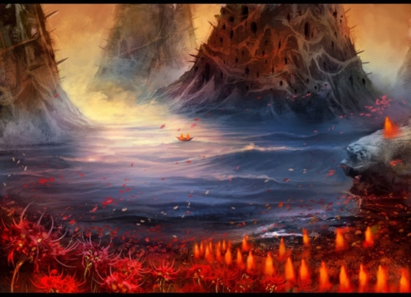 Trên đường Hoàng Tuyền có hoa Bỉ Ngạn màu đỏ, từ xa mà nhìn thì giống như là tấm thảm máu trải dài, vì loài hoa này có màu đỏ như lửa nên được ví là “đường lửa chiếu rọi”. Cũng bởi nó là cảnh vật và màu sắc duy nhất trên con đường Hoàng Tuyền dài đằng đẵng này, nên mọi người cứ đi theo hoa này mà thông đến địa ngục của cõi u minh.