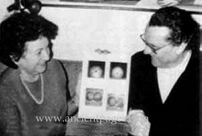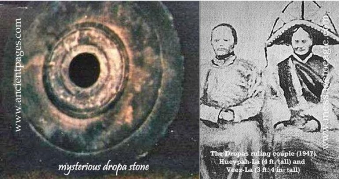 Trái: một đĩa đá Dropa bí ẩn. Một cặp vợ chồng người Dropa. Chồng (Hueypah-La) cao 1,2 m và vợ (Veez-La) cao 1 m. Ảnh chụp năm 1947.