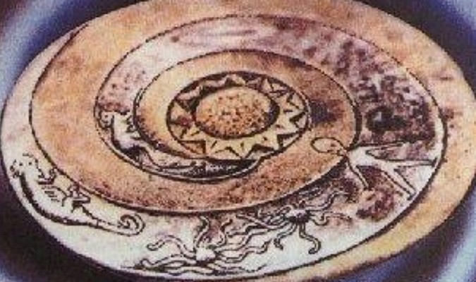 Có một cái lỗ ở trung tâm và một rãnh mịn, được chạm khắc theo hình xoắn ốc từ tâm ra đến viền. Vật thể được xác định niên đại 10000 – 12000 năm tuổi!