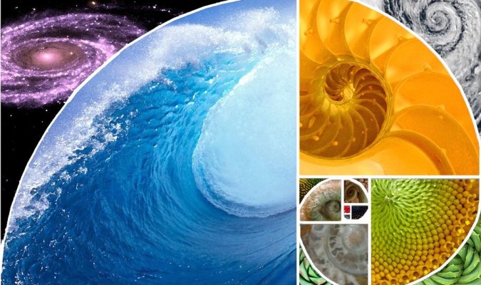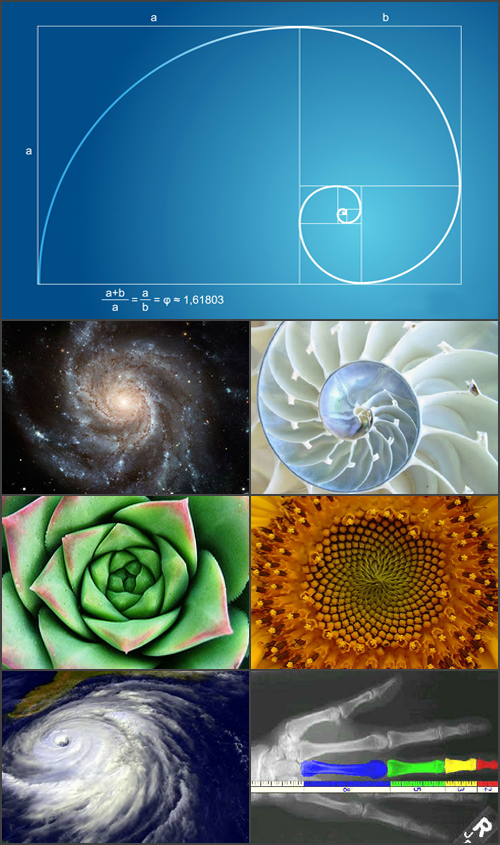 Từ hình chữ nhật cho đến hình xoắn ốc tuân theo tỷ lệ vàng (hình tạo thành bằng cách nối các đỉnh của các hình chữ nhật xếp lồng vào nhau theo tỷ lệ vàng), các ví dụ có thể được tìm thấy ở khắp mọi nơi: trong sừng của một con cừu, những tinh thể khoáng chất, một xoáy nước, một cơn lốc, các dấu vân tay, các cánh hoa hồng, những đài hoa đồng tâm của cây súp-lơ hay hoa hướng dương, chim chóc, côn trùng, cá, dải Ngân hà, hay một số thiên hà khác như thiên hà hàng xóm M51… thậm chí đến cả con ốc sên.